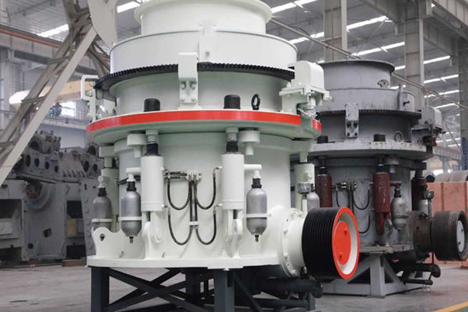 • 结构组成  ---- 圆锥破碎机的主体结构通常由机架、偏心套、主轴、动锥体(含破碎壁)、定锥体(含轧臼壁)、传动装置、液压系统、润滑系统及电气控制系统等关键部件构成。其中,动锥体通过偏心套的旋转驱动,在主轴约束下做复杂的旋摆运动,与定锥体共同围合形成逐渐缩小的破碎腔。物料在腔内历经多次反复的挤压、冲击与弯曲作用而逐步破碎,并依靠自重从排料口排出。